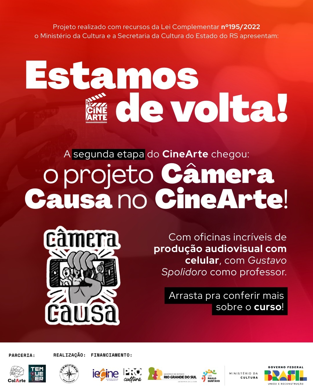 O CineArte – Núcleo de Formação Audiovisual, é realizado pela Território Diverso com apoio do ColArte e do TemQueVer, conta com financiamento da Lei Paulo Gustavo (LPG), IECINE, Pro-Cultura RS, Secretaria de Estado da Cultura, Ministério da Cultura, Governo Federal